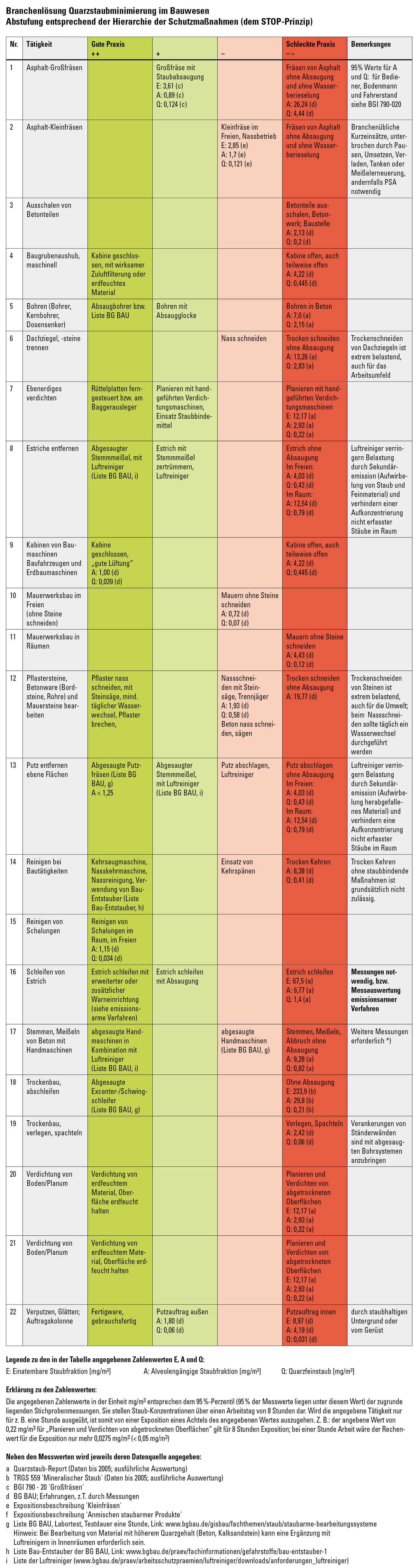 - In den Spalten „Gute Praxis + +“ (grün) bis „Schlechte Praxis - -“ (rot) wird angegeben, welchen Expositionen die Beschäftigten bei Ausübung der Tätigkeit ja nach Arbeitsweise ausgesetzt sind. Links stehen die weniger staubbelasteten Arbeitsweisen, rechts Arbeitsweisen mit den höchsten Belastungen